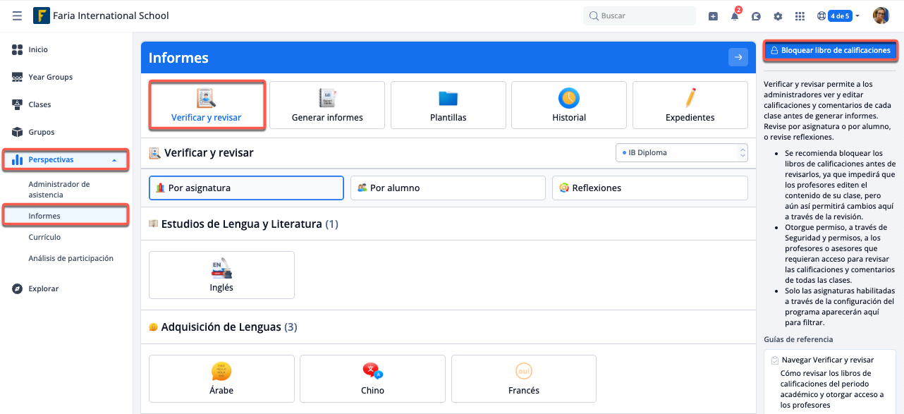 A través de Informes > Verificar y revisar, también puedes acceder a la página Bloquear libros de calificaciones, desde el panel derecho.