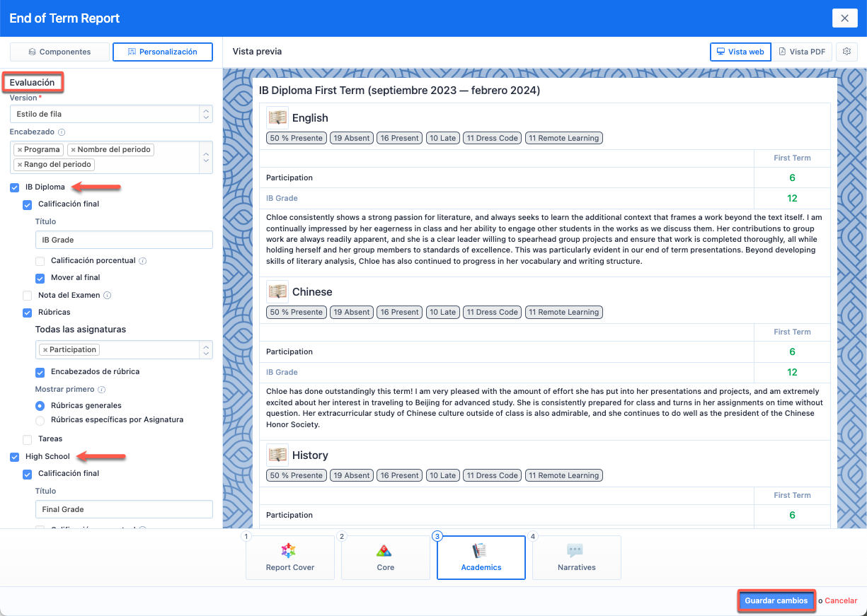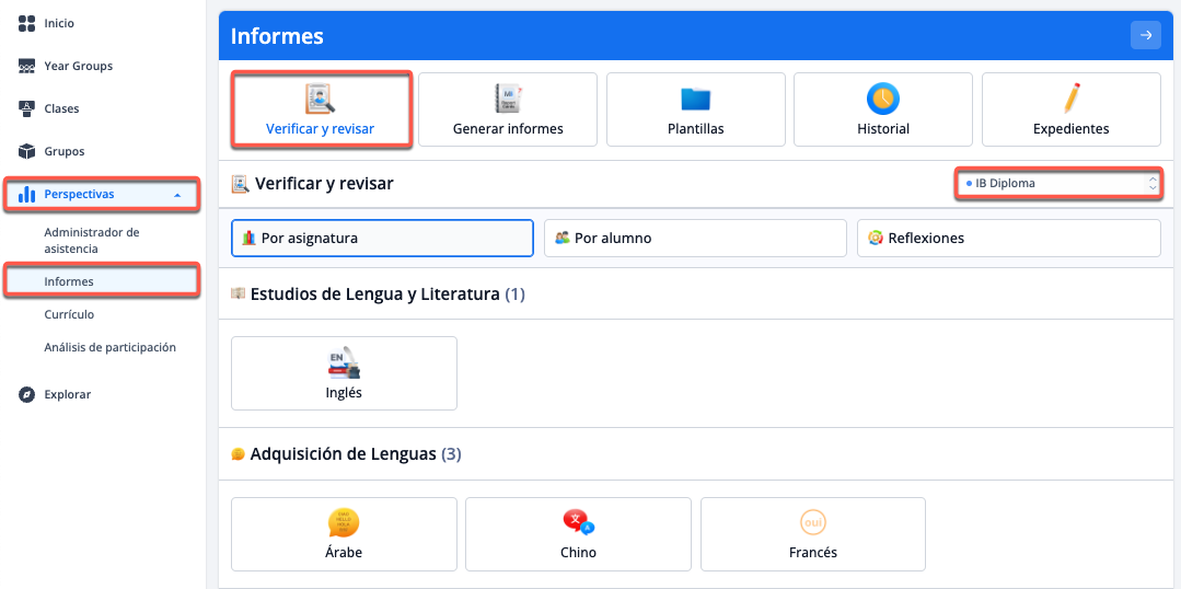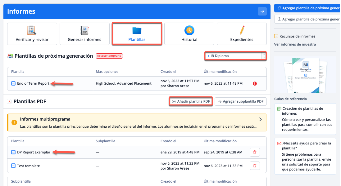Para mostrar las calificaciones y comentarios en los informes de calificaciones, ve a Informes > Plantillas > IB Diploma > Seleccionar plantilla
