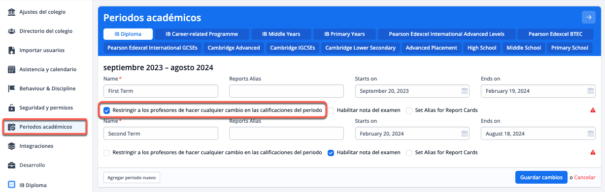 - Marca Restringir a los profesores de hacer cualquier cambio en las calificaciones del periodo.