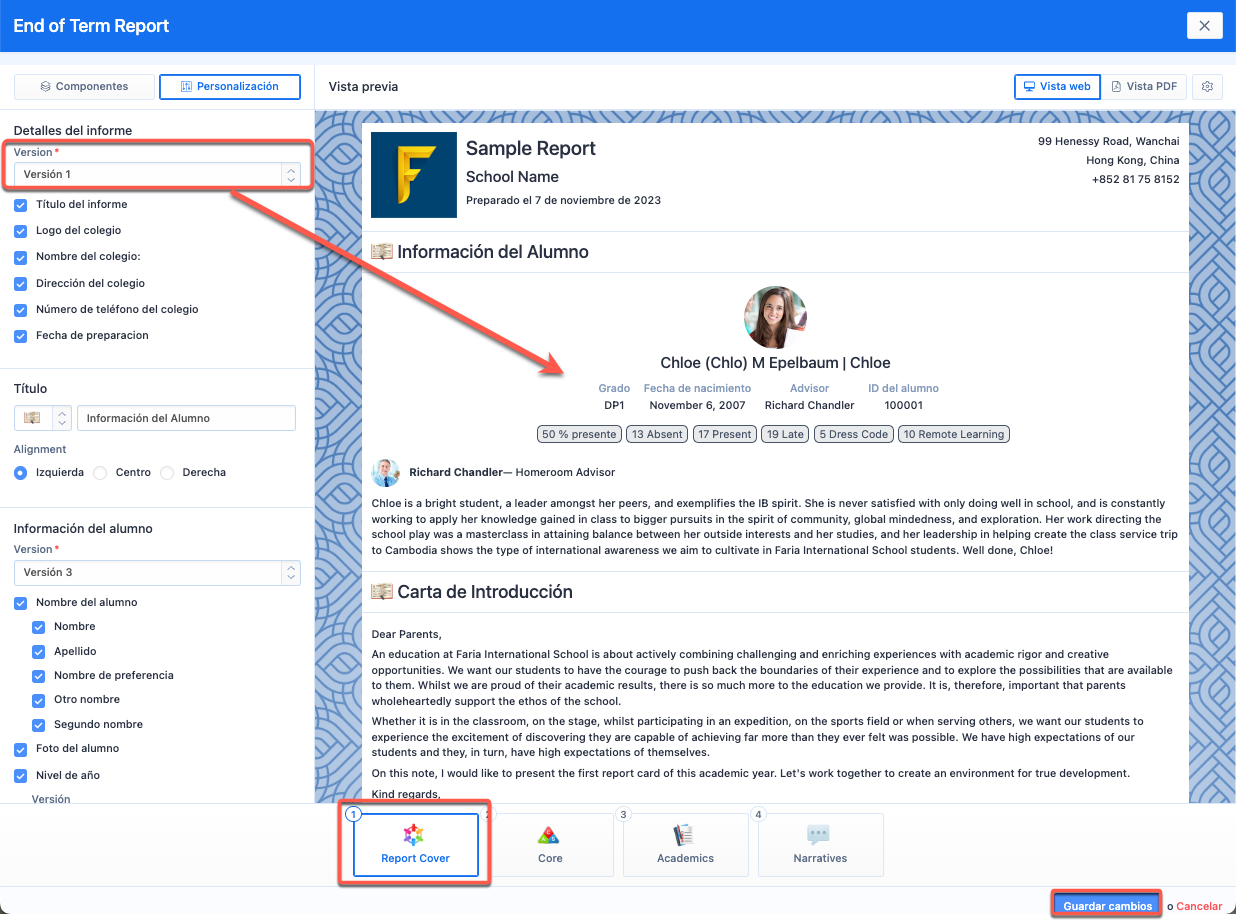 Algunos Componentes, como Detalles del Informe o Información del Alumno, también vienen pre-construidos con diferentes versiones en su diseño para permitir una personalización aún mayor de la plantilla del informe de calificaciones. Recuerde pulsar "Guardar cambios" en la parte inferior derecha cada vez que realice un cambio en los componentes o la personalización de los mismos dentro de una sección.