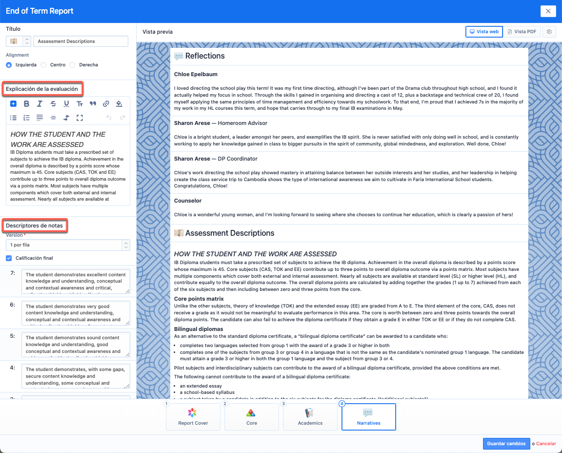 Seleccione la pestaña Descriptores de Calificaciones para personalizar sus Descriptores de Calificaciones y Explicación de la Evaluación se ha convertido en dos componentes de sección separados para Explicación de la Evaluación y Descriptores de Calificaciones que pueden añadirse a cualquier sección de la plantilla por separado y según sea necesario.