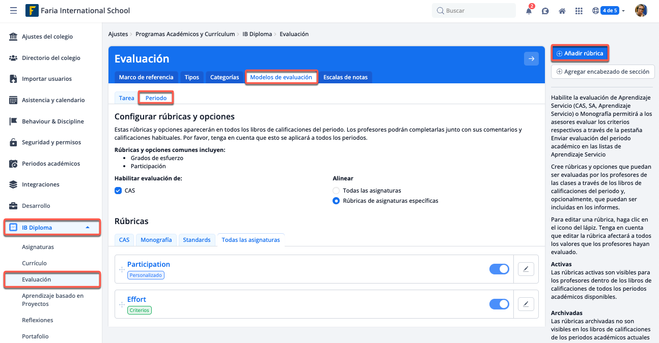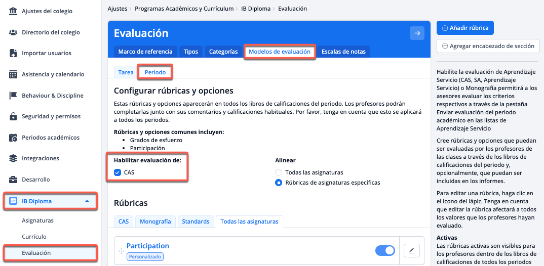 Puedes editar los valores y descriptores de cualquier rúbrica a través de Ajustes > IB Diploma > Evaluación > Modelos de evaluación > Periodo. Habilita las rúbricas de evaluación para CAS marcando la casilla CAS.