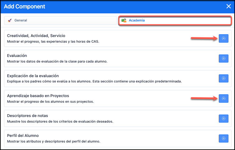 Los componentes principales, como el CAS y el ensayo extendido, TOK para el Diploma del IB, pueden añadirse a las plantillas de informes específicas del programa a través de la lista de componentes Académicos. Seleccione los componentes de Creatividad, Actividad, Servicio o Aprendizaje basado en proyectos para incluir la información de los componentes principales. Cada componente puede añadirse varias veces, utilizando el icono más si desea mostrar información diferente de TOK o EE o CAS en varias secciones del informe.