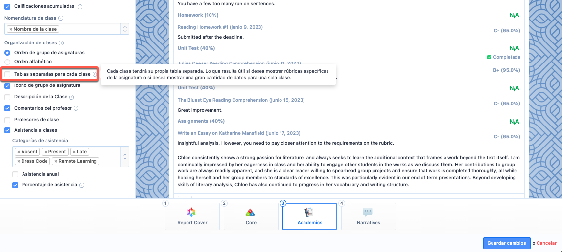 La opción de Informes de Clase añadiría una página por cada clase que el alumno esté tomando. Esto se utilizaba para permitir a las escuelas incluir más detalles por cada clase. Dado que ya no es necesario establecer Secciones, ahora se puede incluir la misma información de Clase en cada componente de Evaluación. Por ejemplo, es posible personalizar qué información de cada clase es visible, así como si las rúbricas deben mostrarse primero como específicas de una asignatura o como generales. Además, todos los componentes de Evaluación incluyen la posibilidad de mostrar las Tareas evaluadas dentro del Trimestre.