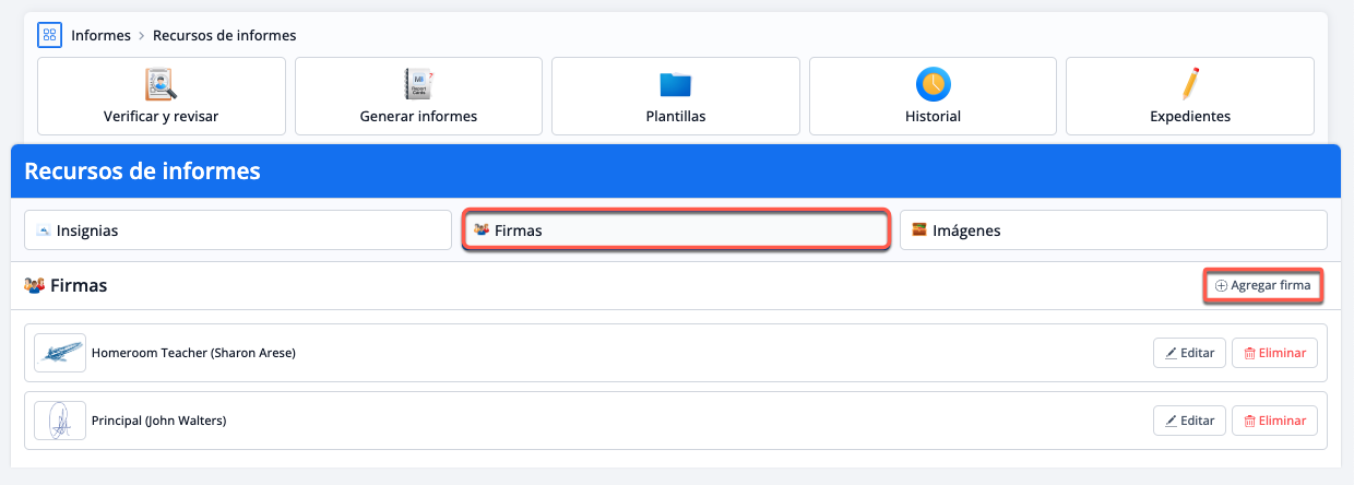 Los colegios pueden seleccionar y configurar determinados tipos de recursos de informes en una biblioteca de recursos de informes para añadirlos a las plantillas de informes a través de los componentes Firma, Imagen o Insignias.