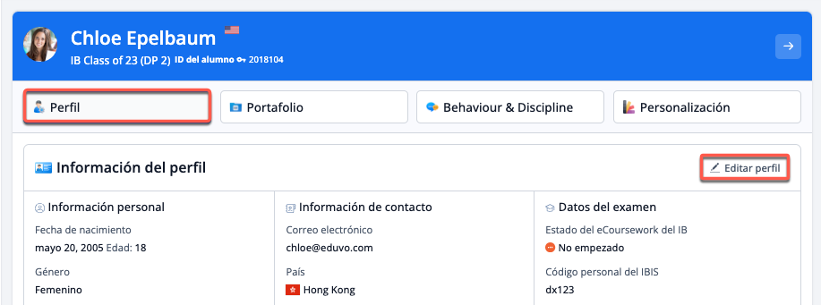 Para ocultar los informes de la vista del alumno y de los padres, accede al perfil del alumno. Pulsa en Editar perfil para encontrar la opción "Ocultar informes".
