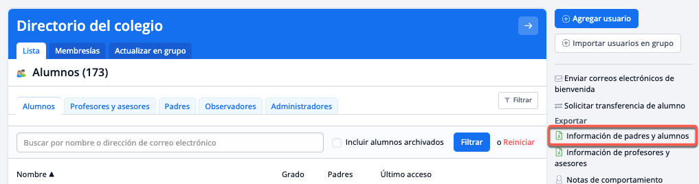 Selecciona Exportar Información de padres y alumnos para descargar un registro de la información de los usuarios en tu Directorio Escolar.