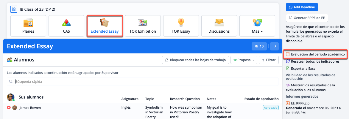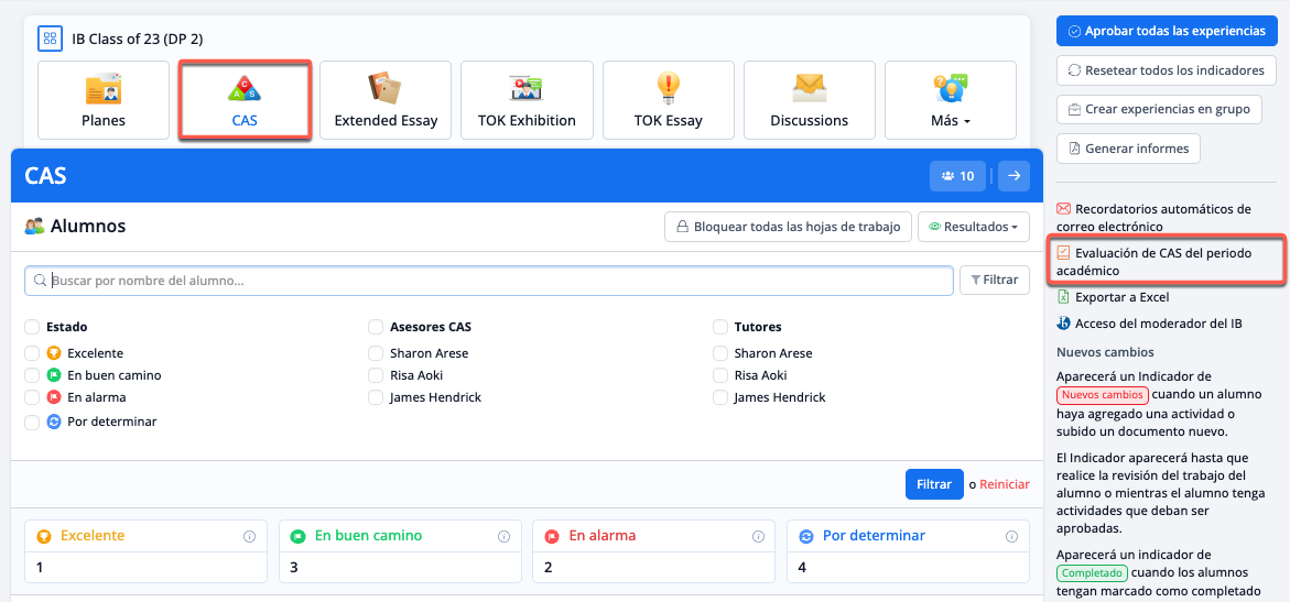 Para añadir las calificaciones CAS y los comentarios narrativos del periodo, ve a tu lista de alumnos CAS a través del Grupo de Año > CAS. Pulsa Evaluación de CAS del periodo académico en el panel de navegación derecho.