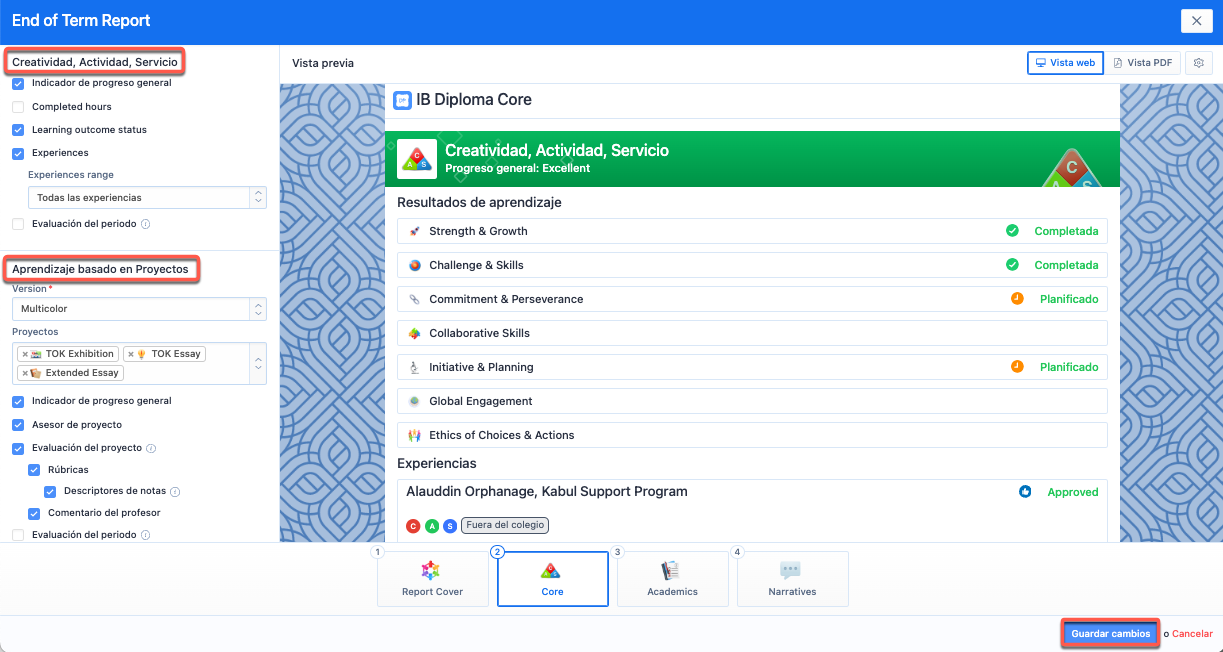 Añade componentes de Creatividad, Actividad, Servicio y Aprendizaje basado en proyectos a cualquier plantilla de informe del Diploma IB y personalízalos para incluir información relacionada con CAS o EE, TOK.