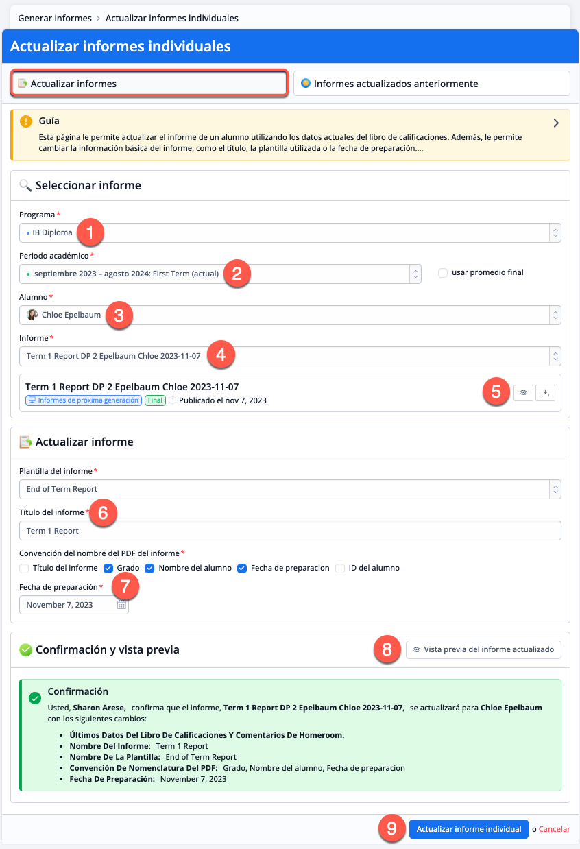 - Pulsa Actualizar informe individual para generar el boletín de calificaciones actualizado y reemplazarlo automáticamente en el perfil del estudiante.
