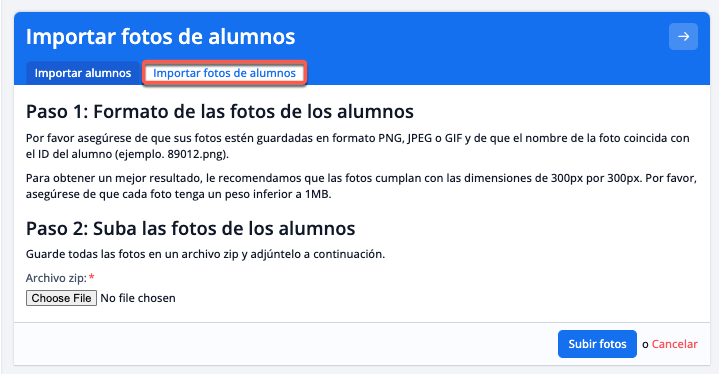 Para mostrar las fotos de los estudiantes en sus informes de calificaciones, primero debes cargar masivamente las fotos de perfil de los estudiantes en el sistema. Para empezar, pulsa en Ajustes > Importar usuarios > Alumnos > Importar fotos de alumnos. Carga un archivo zip con las fotos de los alumnos, en el que el nombre de cada foto coincida con el ID del alumno.