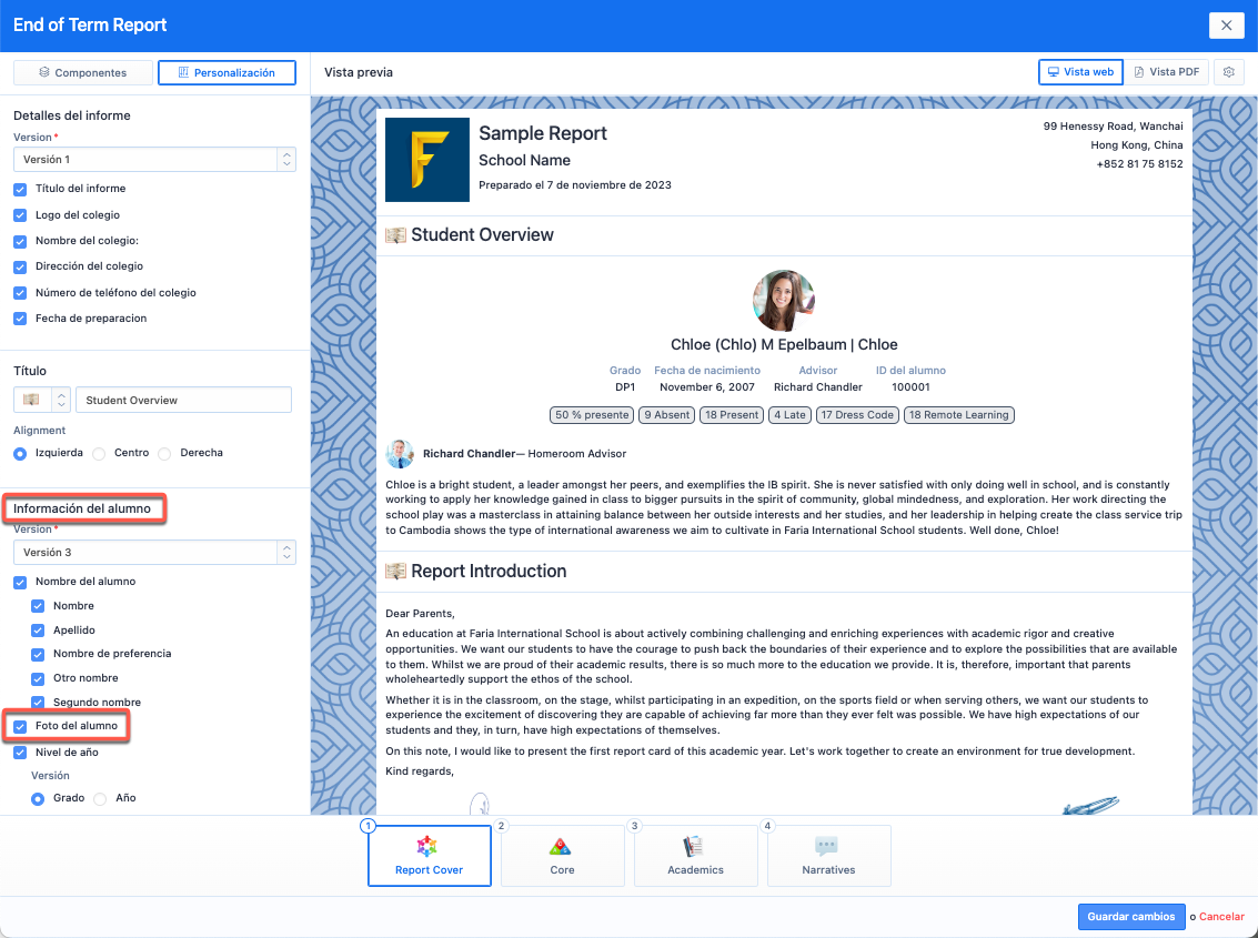 Los informes de los alumnos se generarán con la foto del alumno en el lugar donde se añadieron los componentes Detalles del alumno.