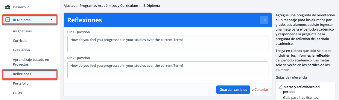 Puedes activar los Objetivos del periodo y las Preguntas de Reflexión para responder en los Perfiles de Estudiante a través de Ajustes > Seleccionar Programa Académico > Reflexiones. Las respuestas a las Preguntas de Reflexión se pueden añadir a los Informes, sin embargo, los Objetivos del periodo sólo se verán en el perfil de Alumno.