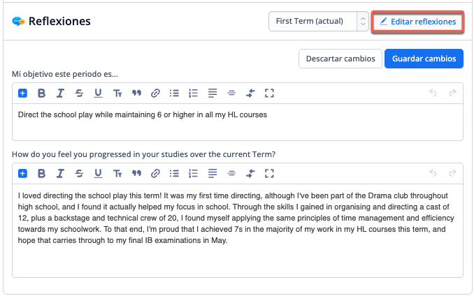 Los estudiantes pueden responder al objetivo del trimestre y a las preguntas de reflexión que añadió en la configuración de su cuenta a través de Perfil > Reflexiones. Asegúrate de guardar los cambios después de responder.