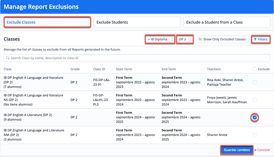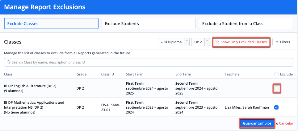 Para excluir clases, selecciona el programa y el nivel de la(s) clase(s) que va(n) a ser excluida(s) de la generación de informes. A continuación, marca la casilla de verificación de la columna "Excluir" de las clases que deseas excluir y Guarda Cambios en la parte inferior de la página. Las clases visualizadas muestran varios datos relacionados con cada clase para facilitar la identificación de la(s) clase(s) correcta(s) a excluir.