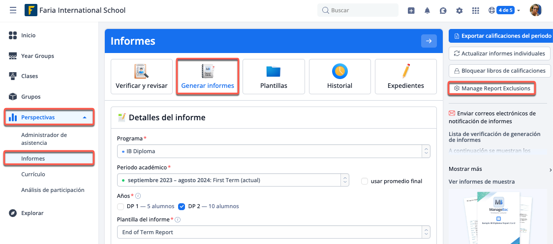 Excluir alumnos y clases a través de Perspectivas > Informes > Generar informes > Gestionar exclusiones de informes
