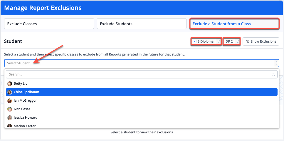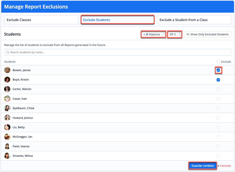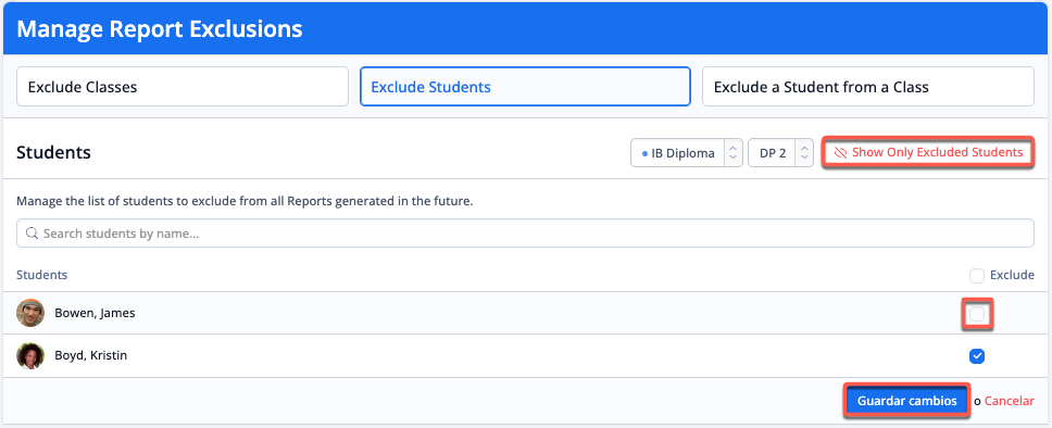 Para excluir a los alumnos, seleccione el programa y el grado de los alumnos que se van a excluir de la generación de informes. A continuación, marca la casilla de verificación de la columna "Excluir" de los alumnos que deseas excluir y Guarda Cambios en la parte inferior de la página.