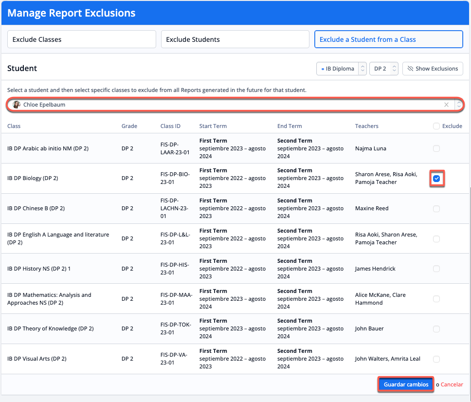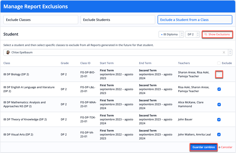 Para excluir clases en informes de alumnos específicos (en lugar de excluir la clase para todos los alumnos del curso), selecciona el programa, el curso y el alumno. Aquí puedes ver la lista de clases activas a las que pertenece el alumno y marcar la casilla bajo la columna "Excluir", para excluir la(s) clase(s) que no quieras que aparezca en el informe de este alumno. Pulsa Guardar Cambios en la parte inferior de la página.