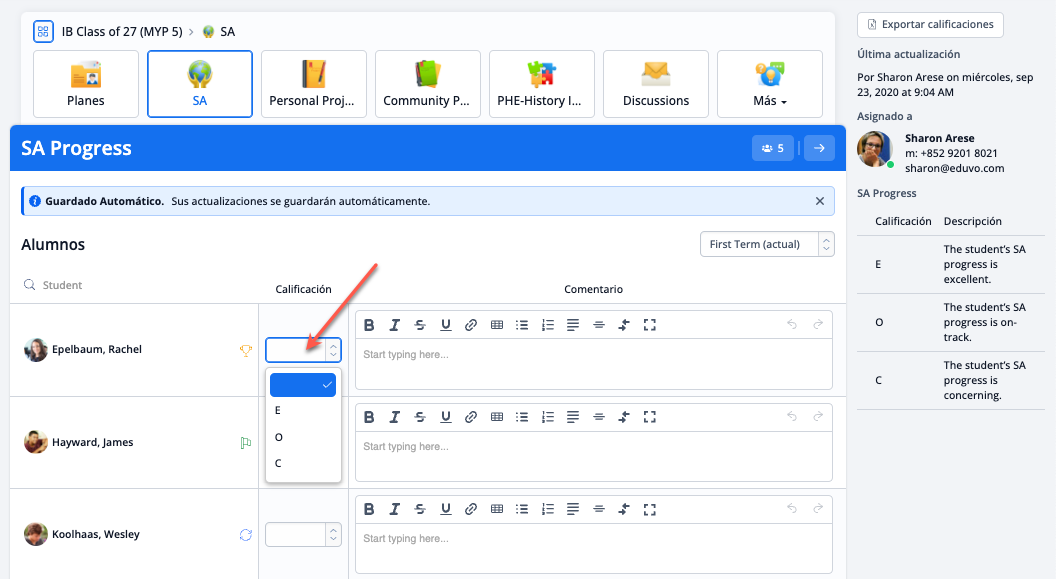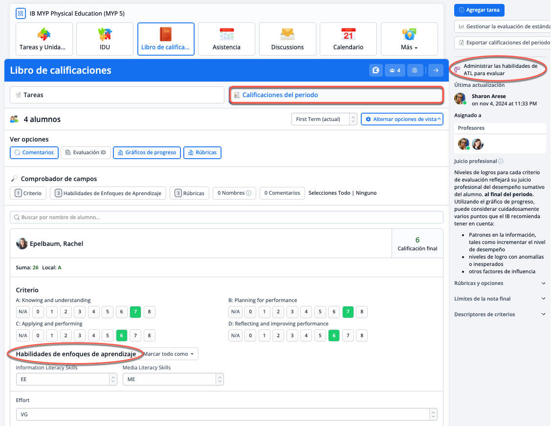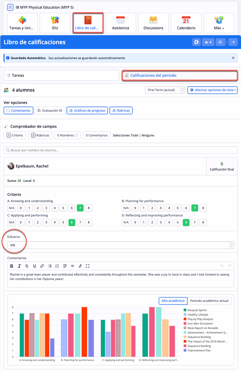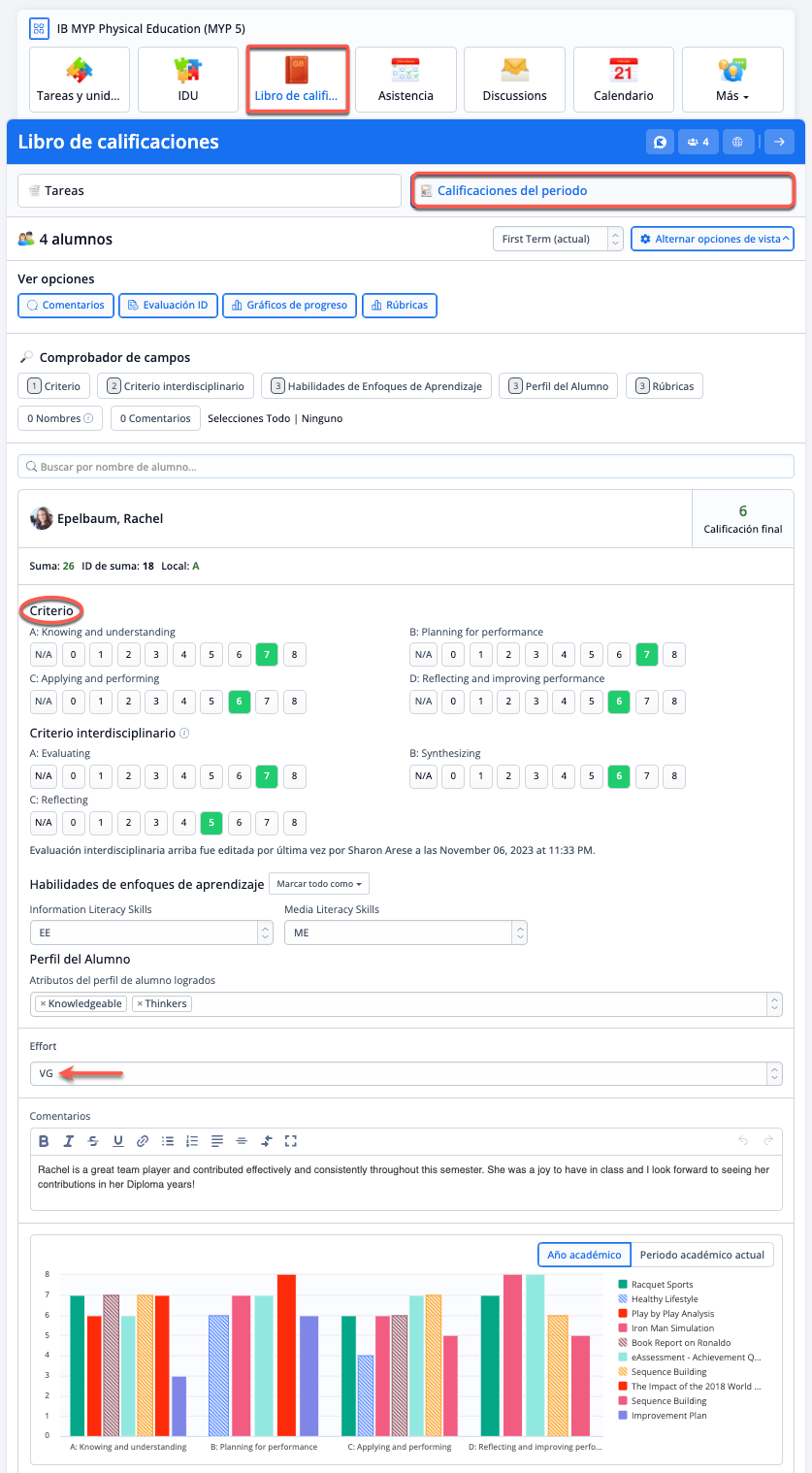En la pestaña Libro de Calificaciones de una clase, los profesores pueden añadir calificaciones periódicas. Aquí el profesor puede establecer los niveles de logro, la nota final del IB y los comentarios del periodo.