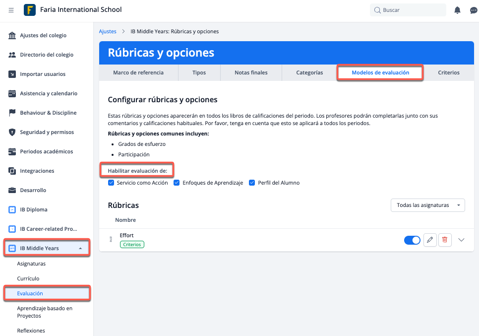 Puedes activar la evaluación de Enfoques del aprendizaje, Perfiles del Alumno o Rúbricas personalizadas (por ejemplo, la Rúbrica de esfuerzos) accediendo a Ajustes > IB Middle Years > Evaluación > Modelos de evaluación: