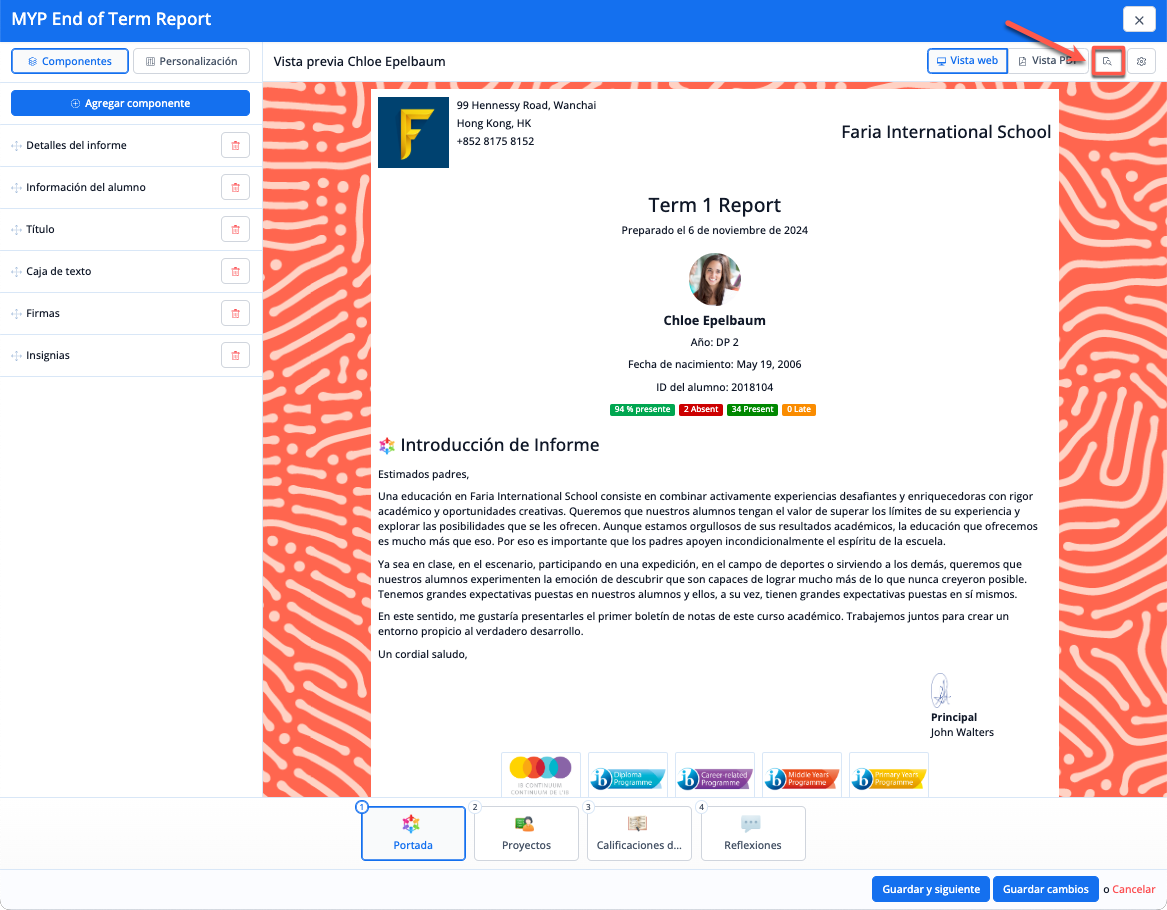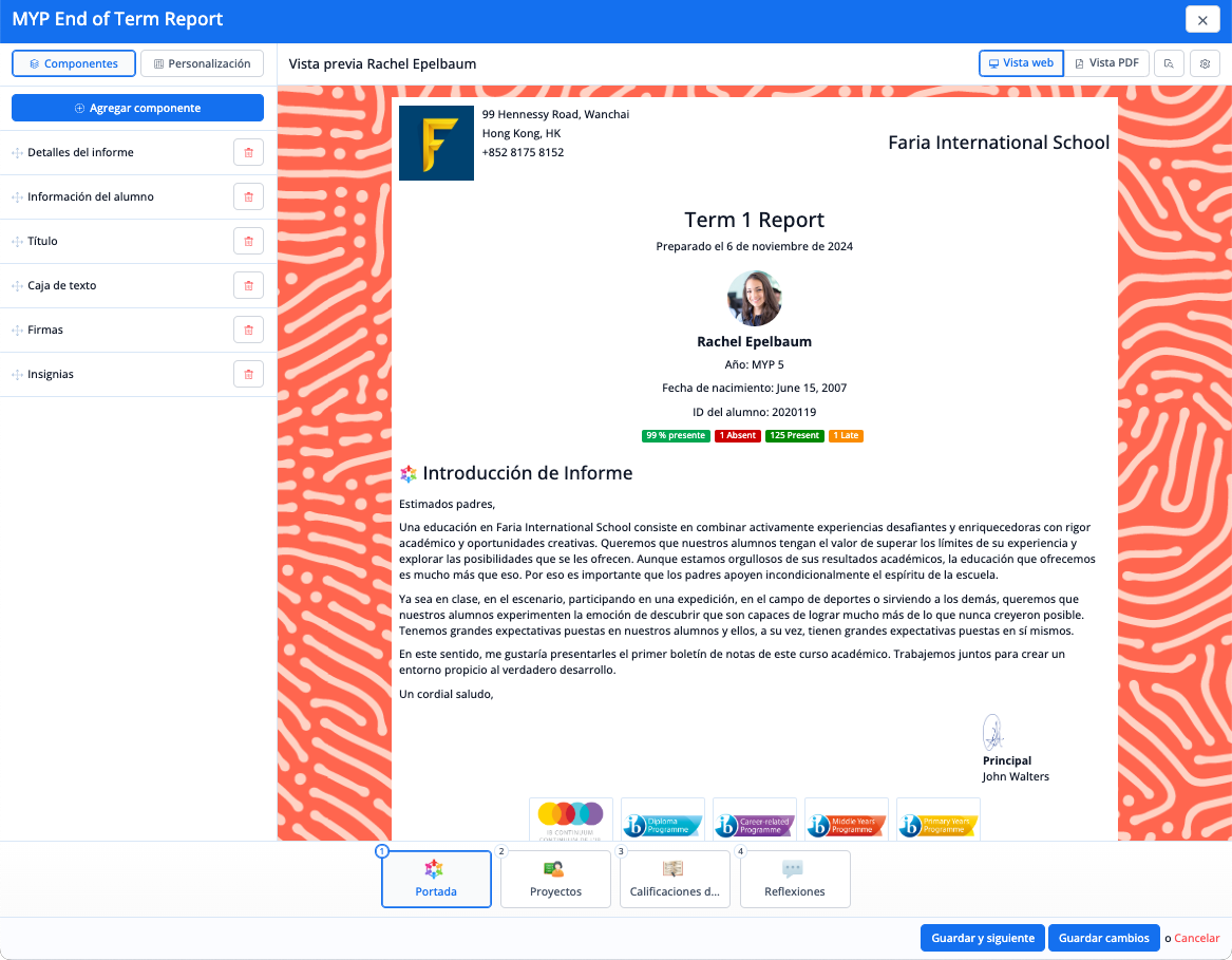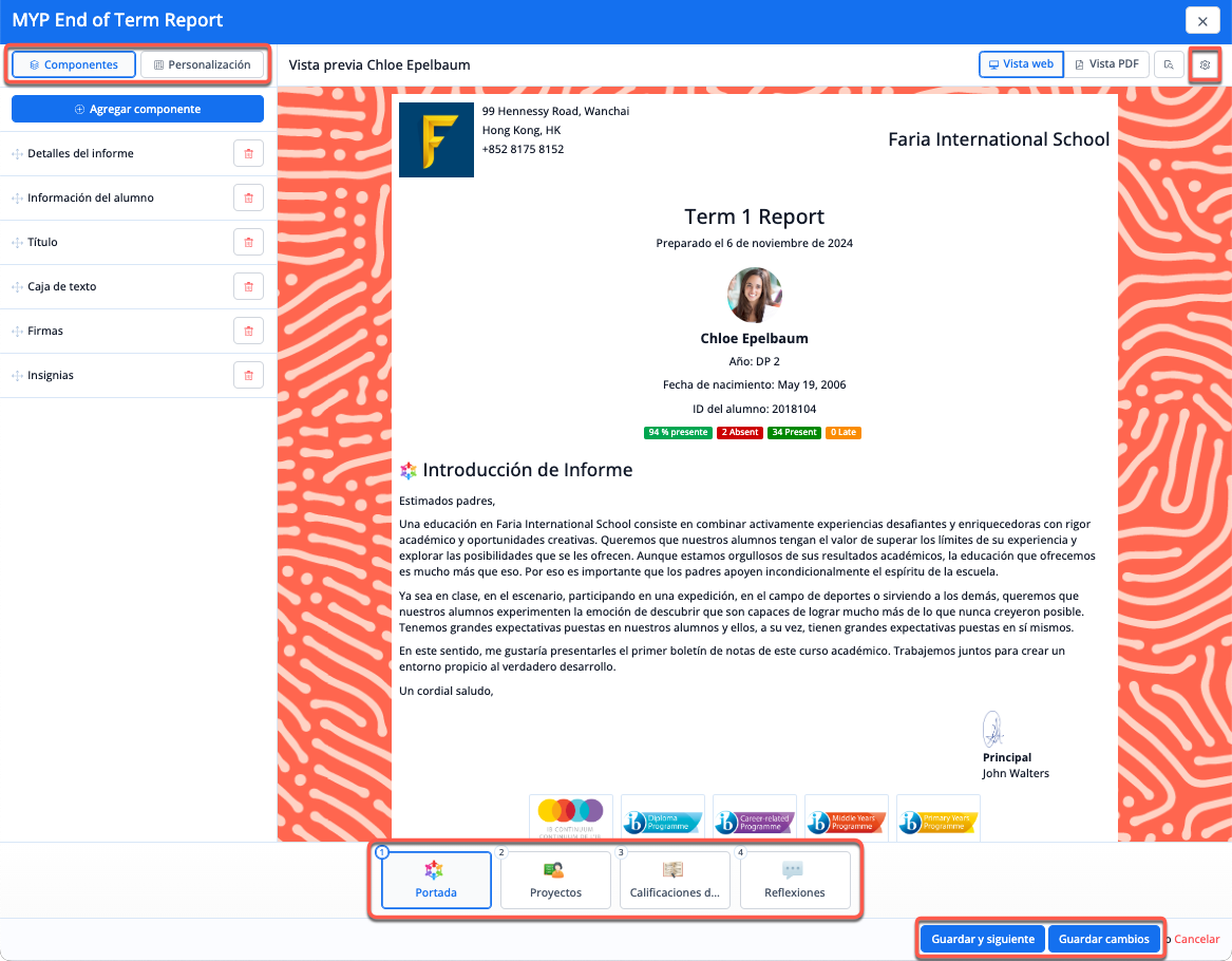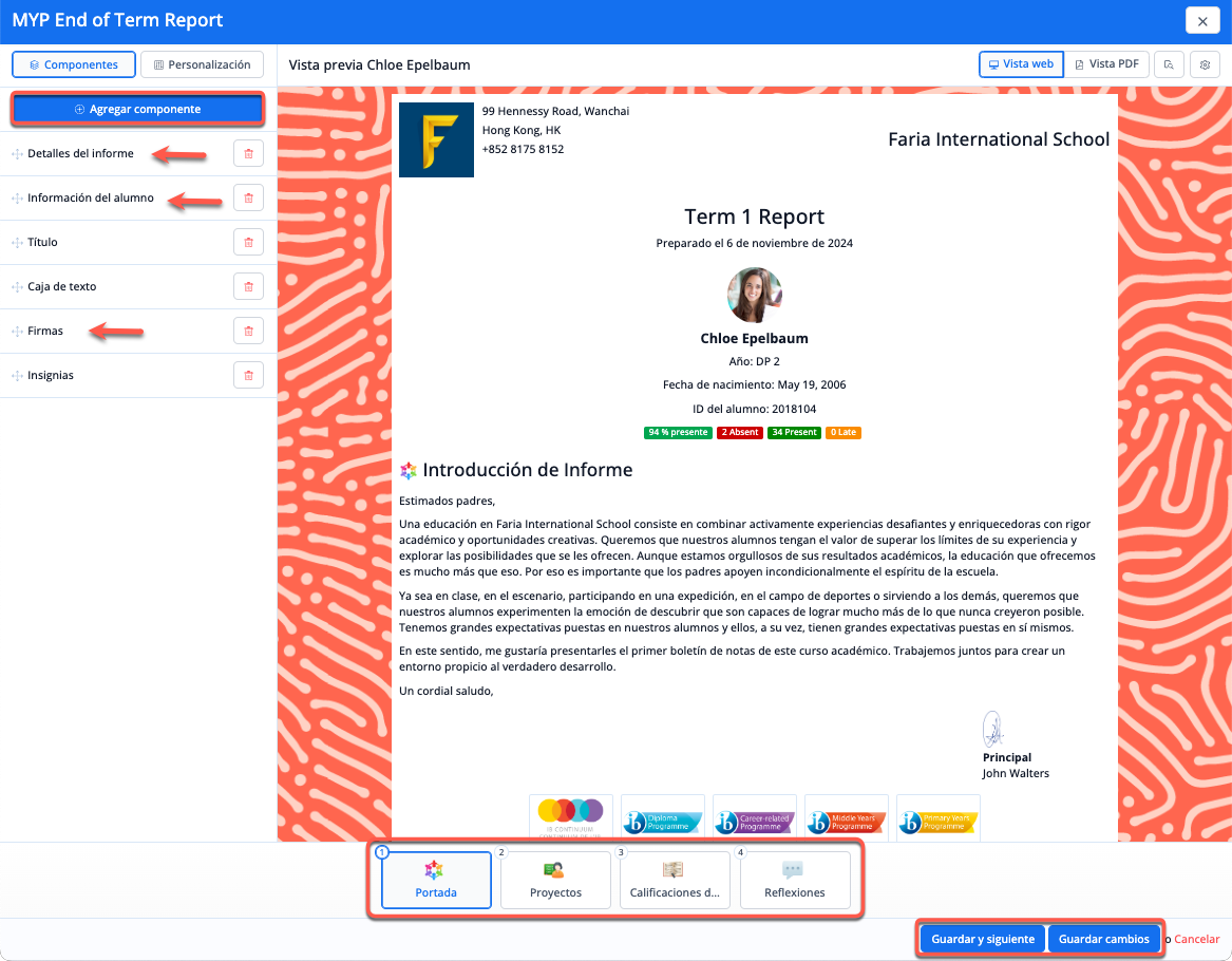 A cada sección se le pueden añadir componentes a través del menú de la izquierda, que se pueden personalizar o arrastrar en el orden que se desee. La pantalla central de vista previa se actualizará con cada cambio realizado en el menú de la izquierda para ofrecer una vista previa en tiempo real del aspecto que tendrá el boletín de calificaciones.