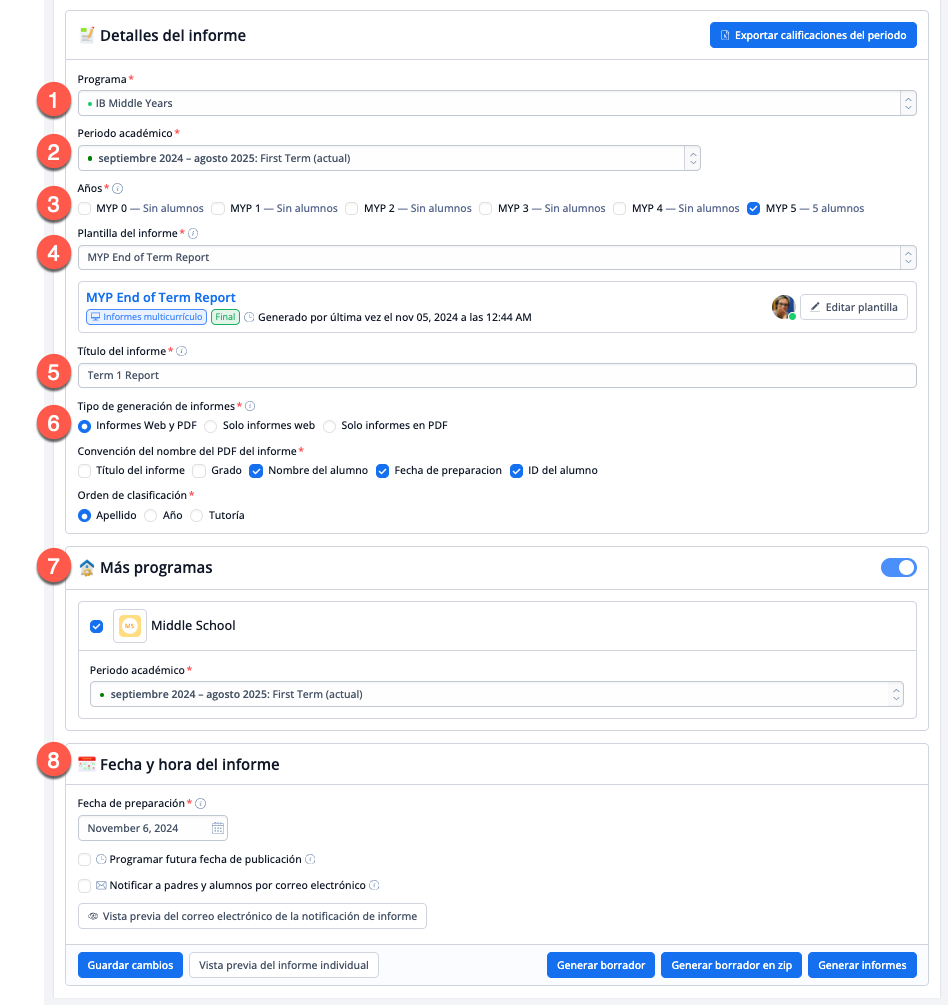 - Programa: Asegúrate de que se selecciona el programa del Diploma del IB para los boletines de notas del PD del IB