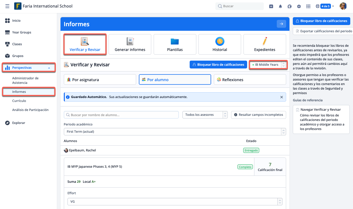 Verificar y Revisar es una función disponible para cualquier colegio con el módulo de informes, y permite a los administradores ver y editar las calificaciones y comentarios de cada clase antes de generar los informes.