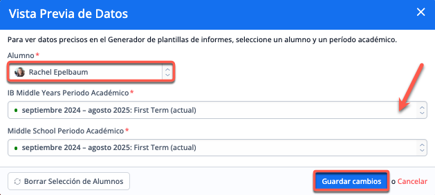 A partir de ahí, podrás seleccionar un alumno en el menú desplegable y seleccionar un período académico. Podrás seleccionar los periodos académicos para cada programa elegido en la plantilla y, a continuación, Guardar cambios.