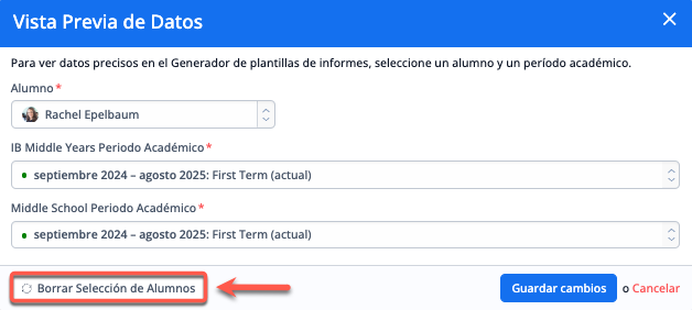 Los datos del alumno sustituirán a los datos por defecto en el generador de Plantillas de Informe. Puedes seleccionar Borrar Selección de Alumnos para volver a los datos por defecto.