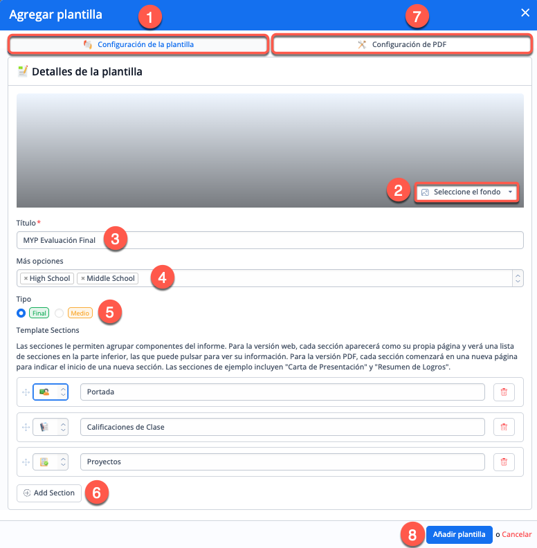 - La Configuración de la plantilla: Esto permite a los colegios establecer configuraciones de plantilla y secciones que son los bloques de construcción básicos de las plantillas de informes web.