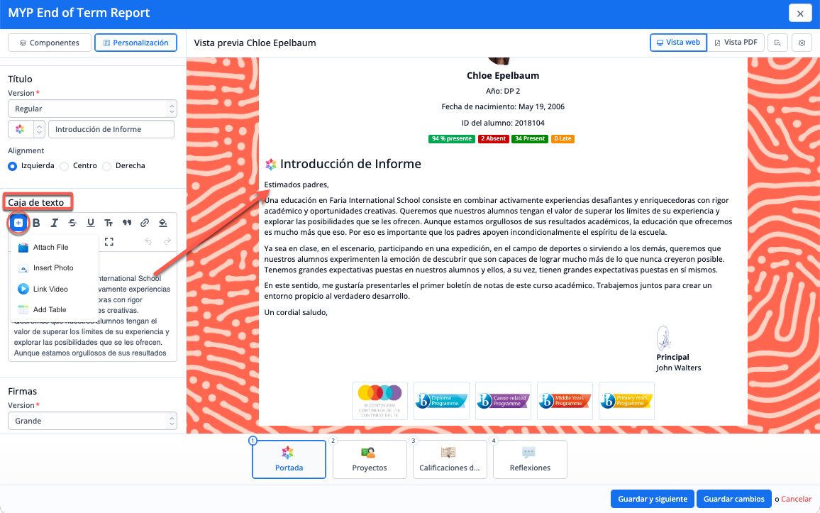 Lo que antes aparecía como una parte separada de la plantilla de informe en "Carta de presentación" ahora está disponible en cualquier sección de plantilla de informe que utilice un componente de cuadro de texto. Todos los componentes de la casilla de texto incluyen una funcionalidad completa de editor de texto enriquecido para que se les pueda añadir archivos, fotos, enlaces de vídeo o tablas.