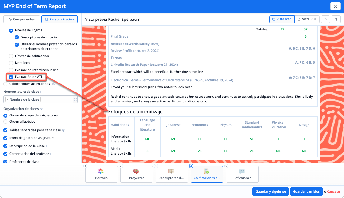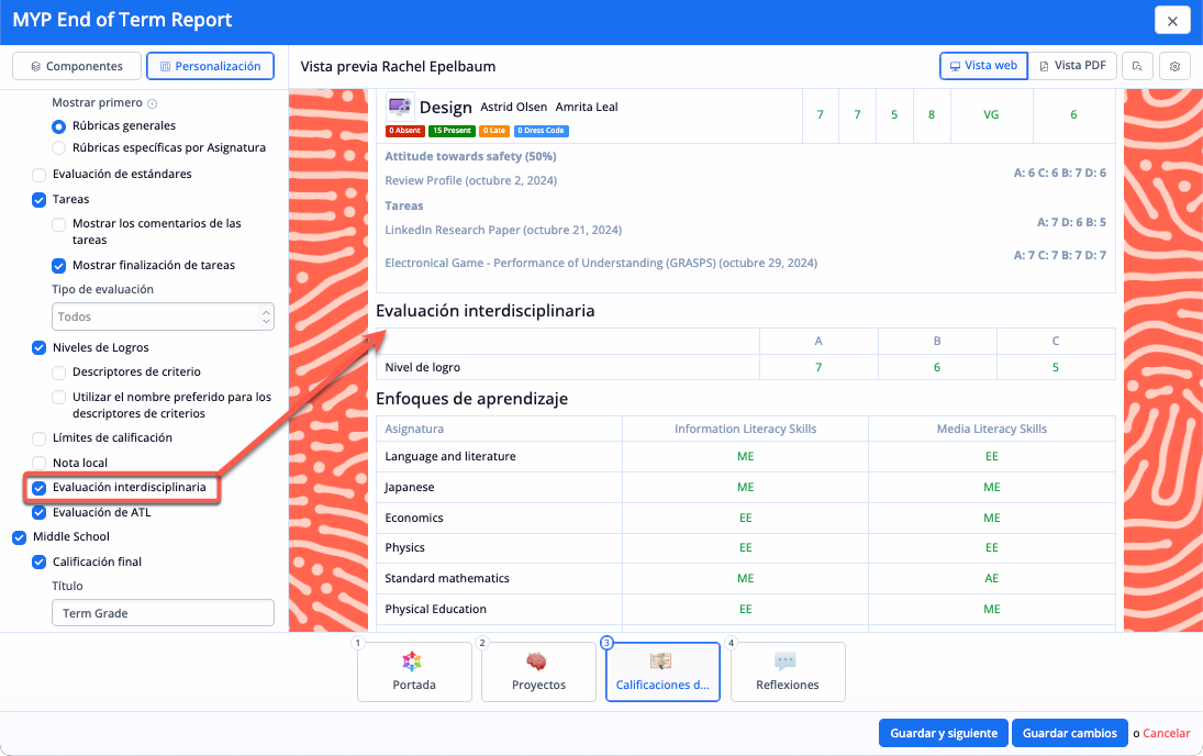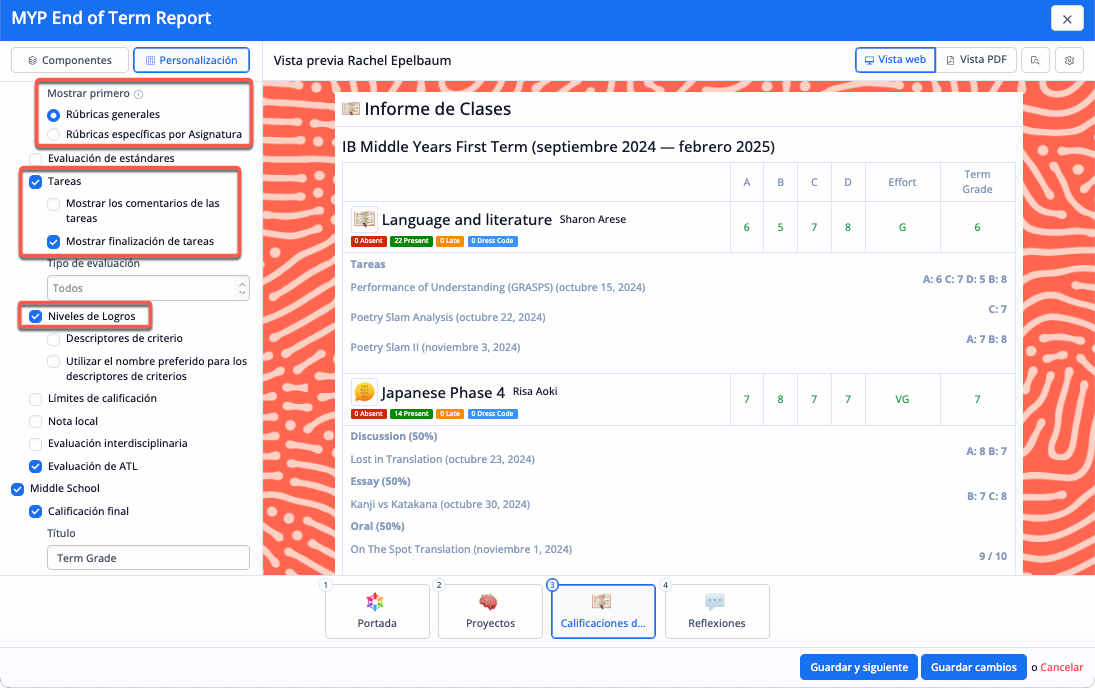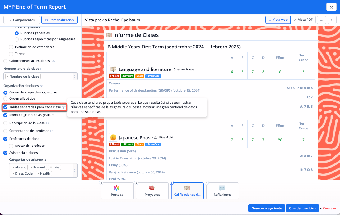 La opción de Informes de Clase añadiría una página por cada clase a la que asiste el alumno. Esto se utilizaba para permitir a los colegios incluir más detalles por cada clase. Dado que ya no es necesario establecer secciones, ahora se puede incluir la misma información de Clase en cada componente de Evaluación. Por ejemplo, es posible personalizar qué información de cada clase es visible, así como si las rúbricas deben mostrarse primero como específicas de la asignatura o como generales. Puedes elegir mostrar los descriptores de nivel de logro del PAI, además de las rúbricas específicas de la asignatura. Además, todos los componentes de evaluación incluyen la posibilidad de mostrar las tareas evaluadas durante el trimestre.