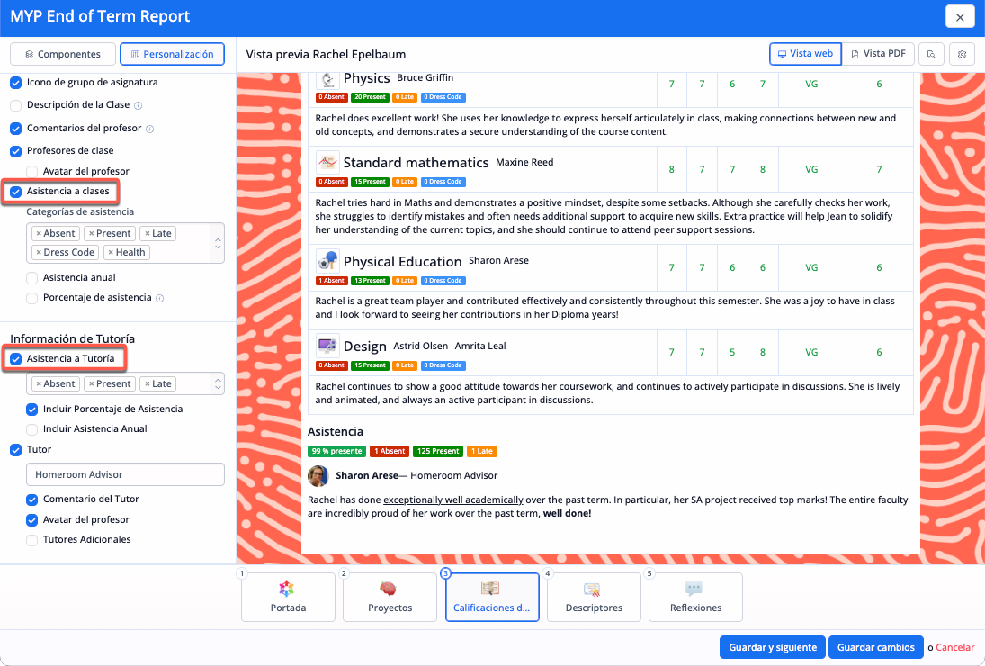 Otras opciones de personalización de los componentes de evaluación son la inclusión de la asistencia a clase, los comentarios de los profesores o la visualización de logotipos de grupos de asignaturas o fotos de avatares de profesores.