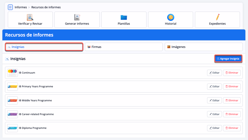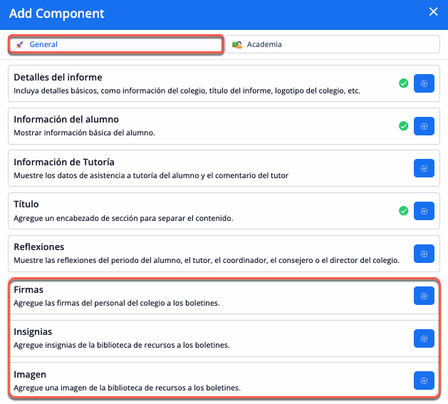 Los colegios pueden seleccionar y configurar determinados tipos de recursos de informes en una biblioteca de recursos de informes para añadirlos a las plantillas de informes a través de los componentes Firma, Imagen o Insignias.