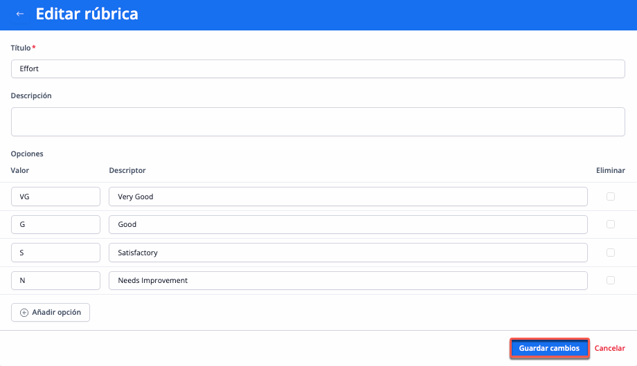 Para empezar, pulsa Añadir rúbrica para crear una nueva rúbrica.