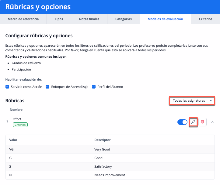 Marca la casilla Enfoques del Aprendizaje para habilitar las rúbricas EDA. A continuación, pulsa la pestaña EDA para personalizar los criterios de evaluación pulsando el icono de edición (lápiz) situado junto al título de la evaluación. Los niveles de evaluación incorporados por defecto son: EE (Exceeding Expectations), ME (Meeting Expectations), AE (Approaching Expectations), y BE (Below Expectations).