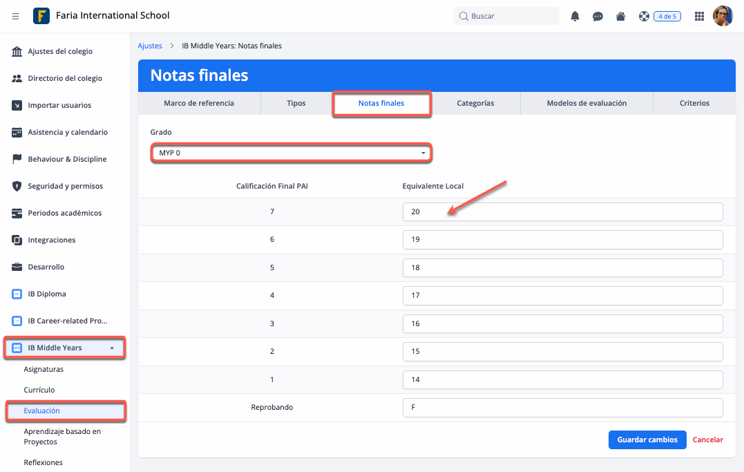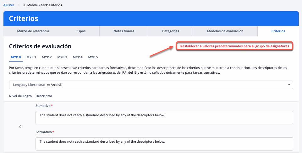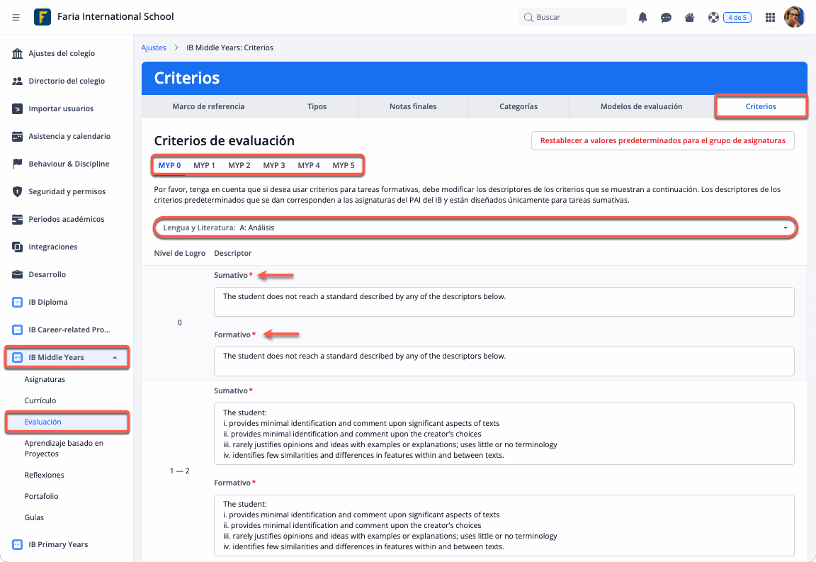 A través de Ajustes > IB Middle Years > Evaluación > Modelos de evaluación