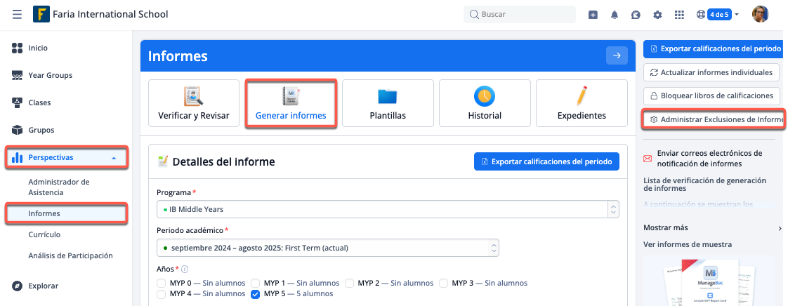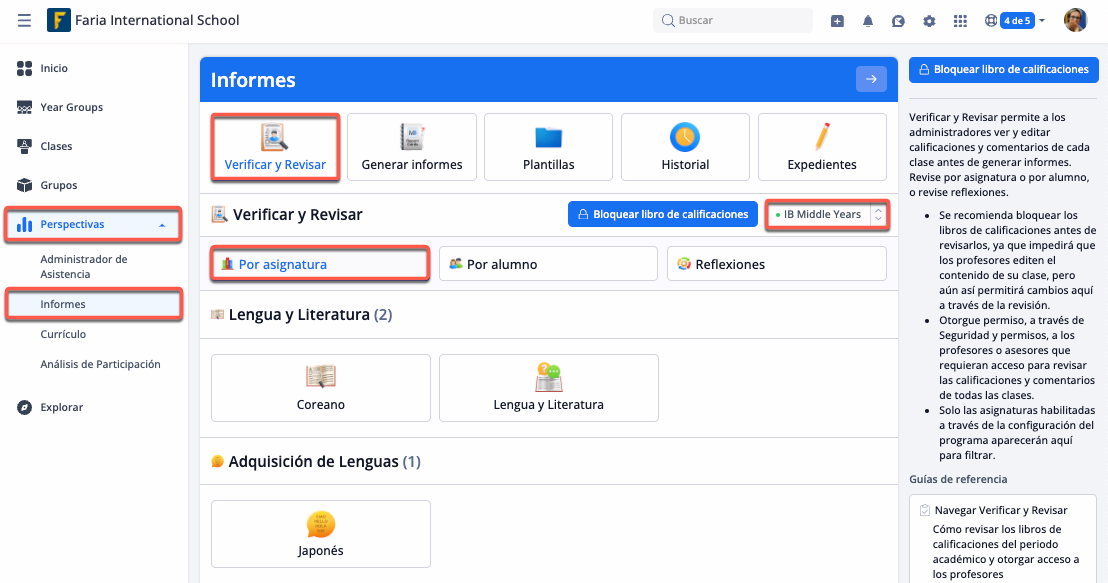 Desde Perspectivas > Informes > Verificar y Revisar > IB Middle Years
