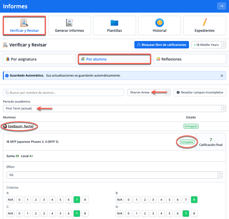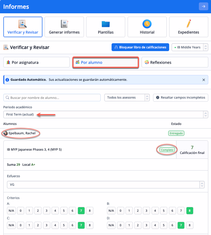Navega hasta Verificar y Revisar > Selecciona IB Middle Years. Desde aquí puedes ver y editar las calificaciones de todas las clases por Asignatura o por Alumno.