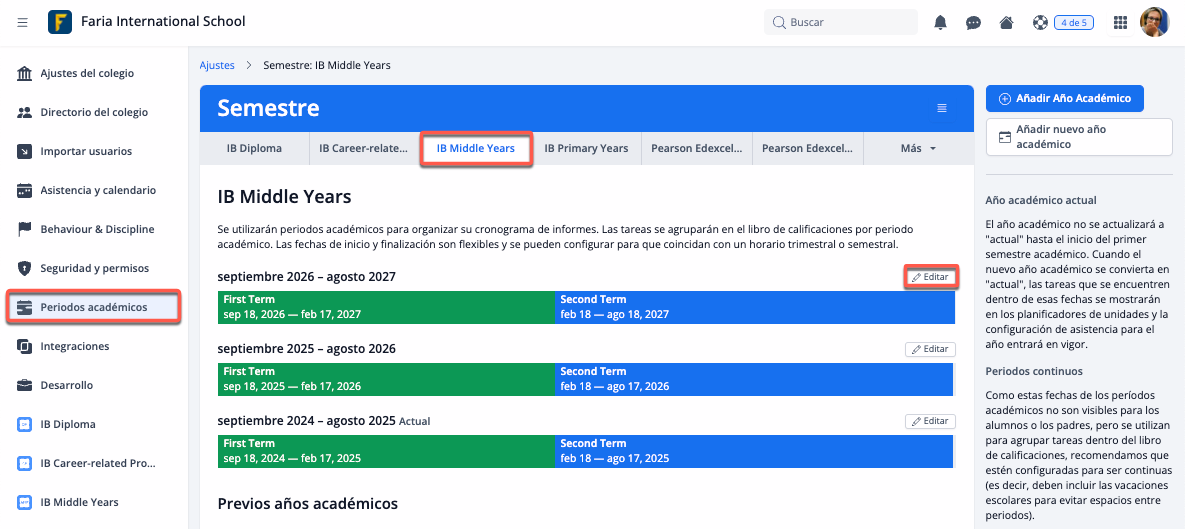 A través de Ajustes > Periodos académicos > Editar Año académico