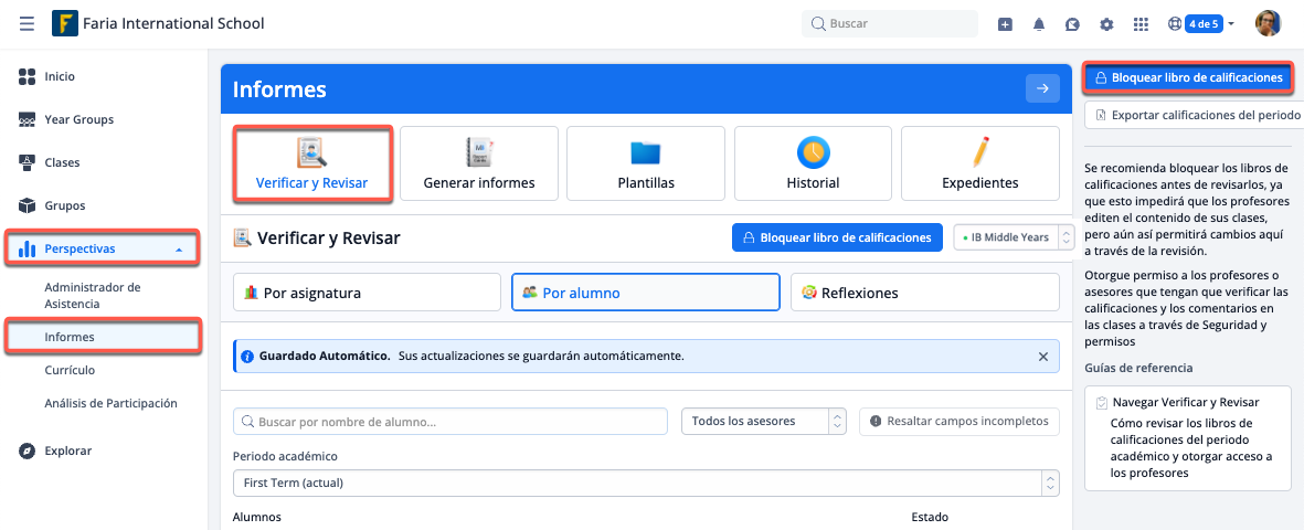 Antes de la revisión, recomendamos bloquear los libros de calificaciones del periodo.