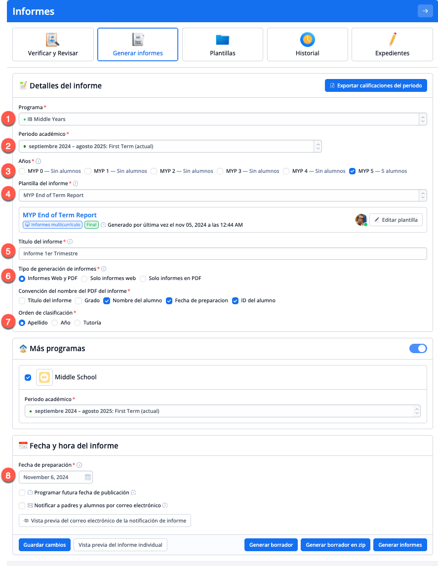 Cuando consideres que los informes están listos, pulsa Generar Informes. También se generará un archivo de informes completo (versión PDF) que se almacenará como copia maestra en el Historial de informes. Estos informes generados proporcionan datos para los expedientes académicos de los alumnos.