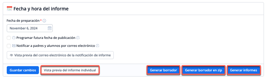 Después de haber hecho la selección, previsualiza los informes antes de generar los borradores finales. Pulsa Previsualizar informe individual para previsualizar el aspecto que tendrá el informe de un alumno, o pulsa Generar borrador para generar un borrador del informe de todos los alumnos del nivel o niveles seleccionados.