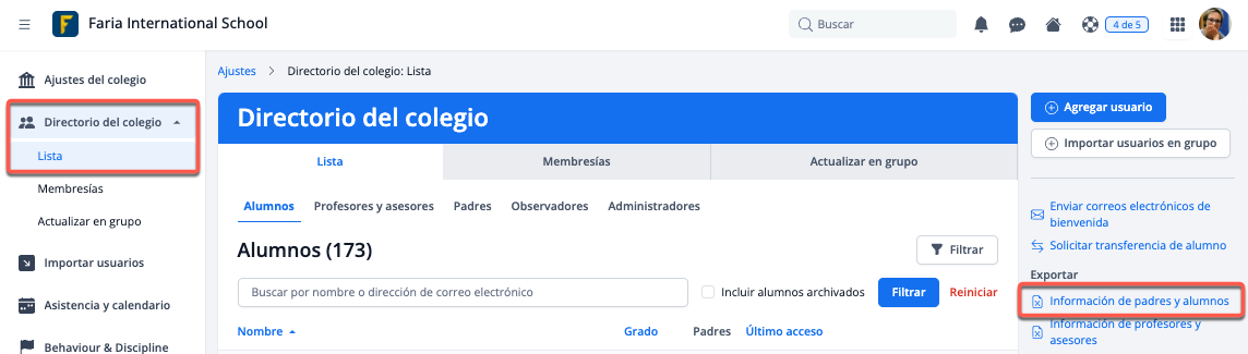 Selecciona Exportar información de alumnos y padres para descargar un registro de la información de los usuarios en tu Directorio Escolar.