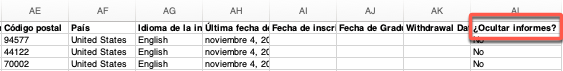 Los administradores pueden exportar una lista de alumnos que muestra qué alumnos han ocultado sus informes.