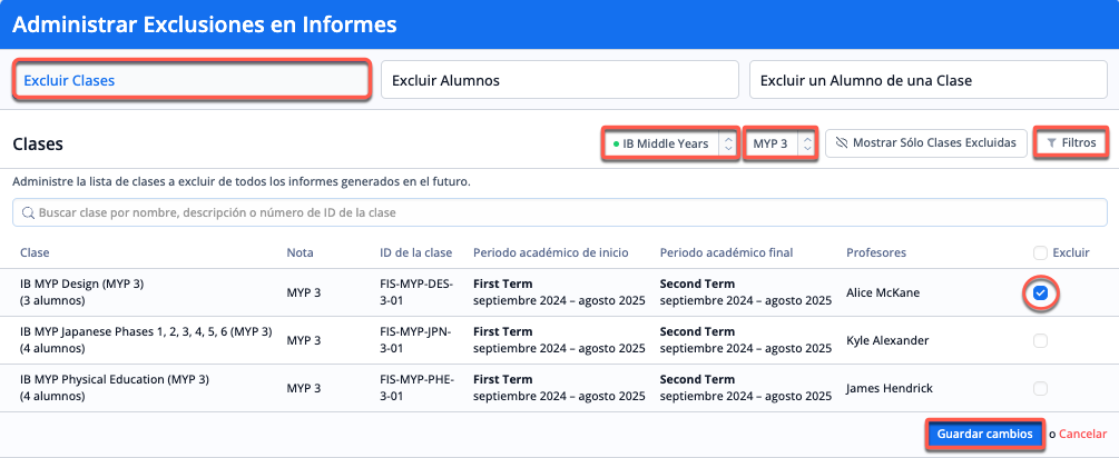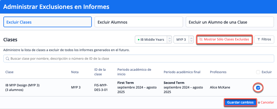 Para excluir clases, selecciona el programa y el nivel de la(s) clase(s) que va(n) a ser excluida(s) de la generación de informes. A continuación, marca la casilla de verificación de la columna "Excluir" de las clases que deseas excluir y guarda los cambios en la parte inferior de la página. Las clases visualizadas muestran varios datos relacionados con cada clase para facilitar la identificación de la(s) clase(s) correcta(s) a excluir.