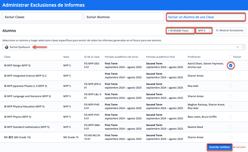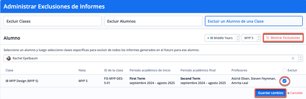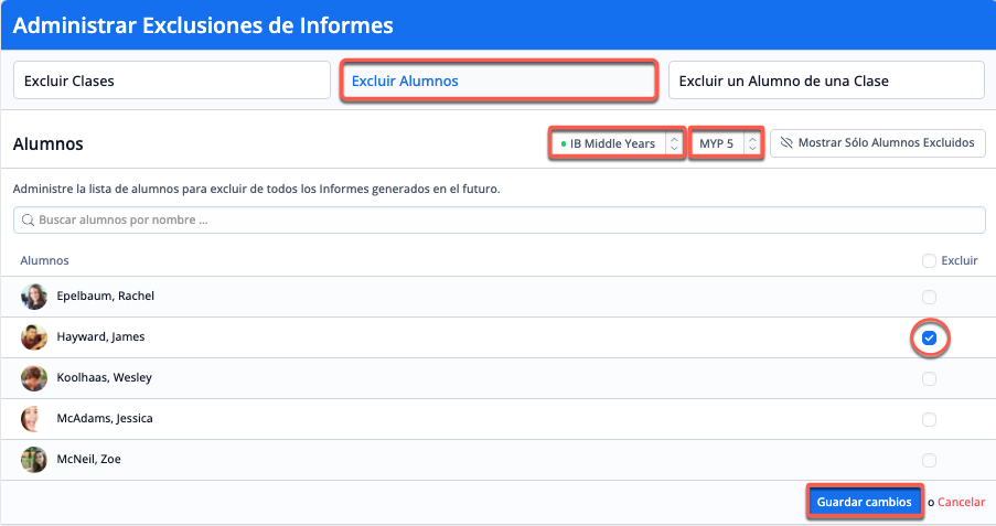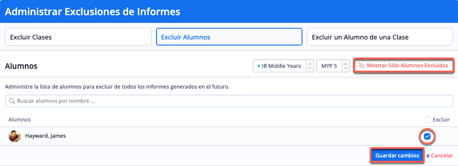 Para excluir a los alumnos, selecciona el programa y el nivel de los alumnos que se van a excluir de la generación de informes. A continuación, marca la casilla de verificación de la columna "Excluir" de los alumnos que deseas excluir y guarda los cambios en la parte inferior de la página.