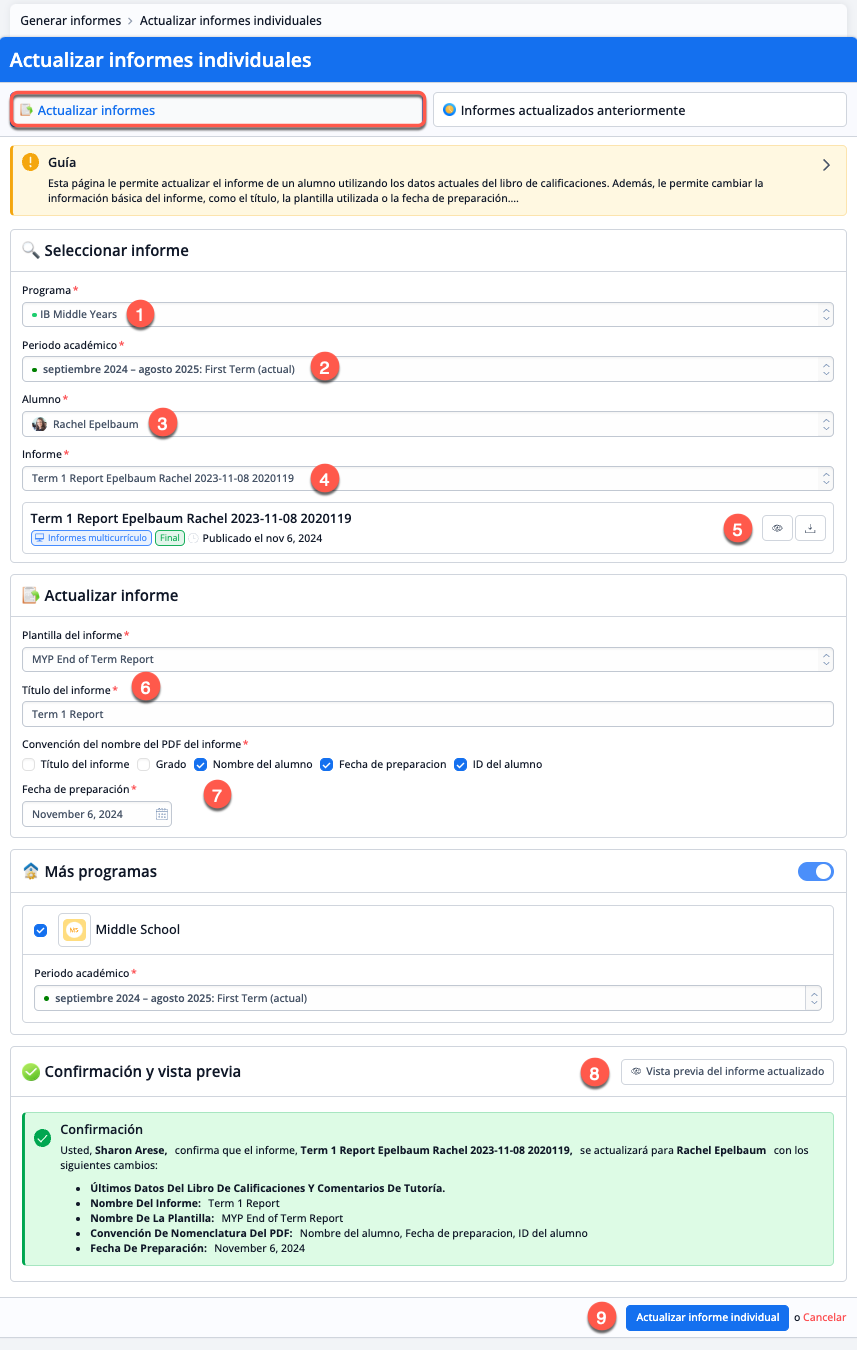 - Pulsa Actualizar informe individual para generar el boletín de calificaciones actualizado y reemplazarlo automáticamente en el perfil del alumno