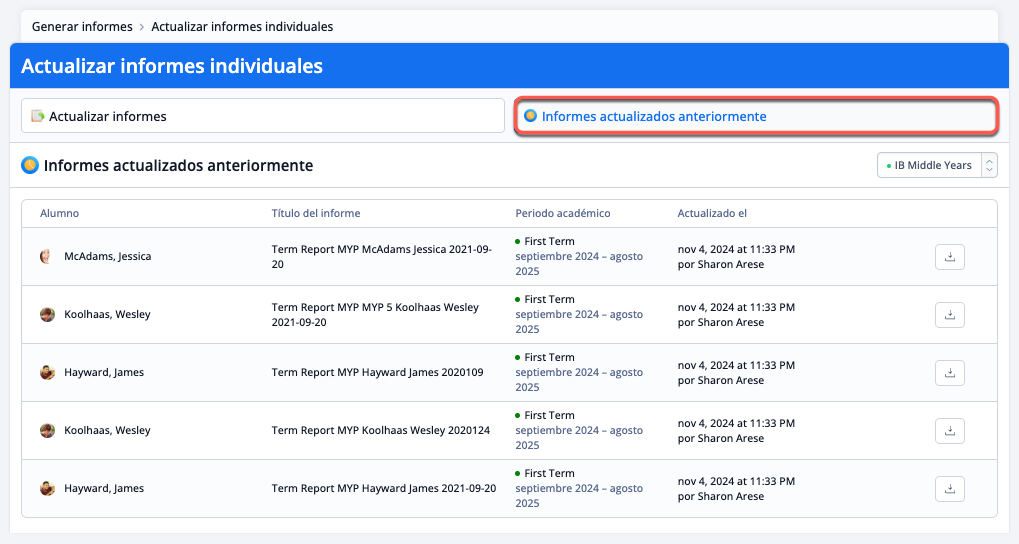 Es posible actualizar el informe de calificaciones de un alumno individual. Después de realizar cambios en las calificaciones de un alumno, vaya a Perspectivas > Informes > Generar informes > Actualizar informes individuales.
