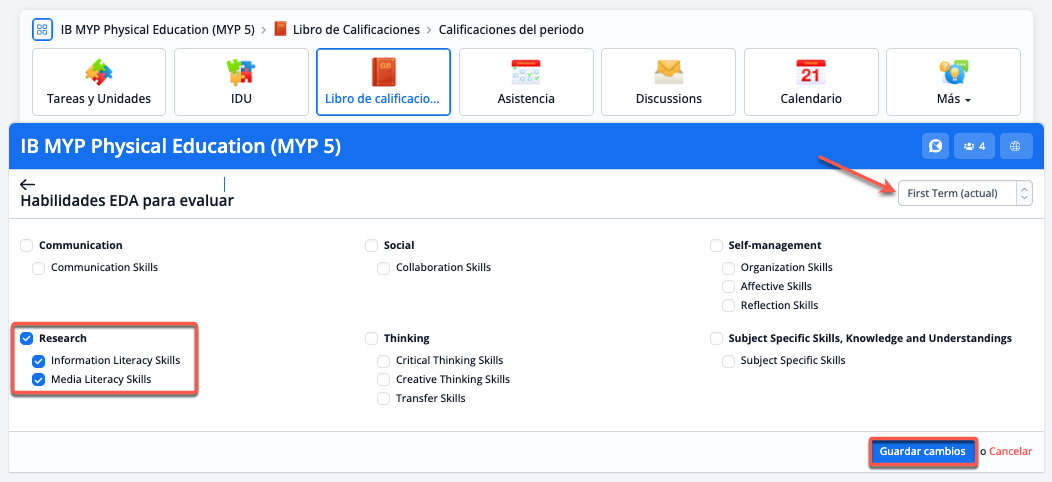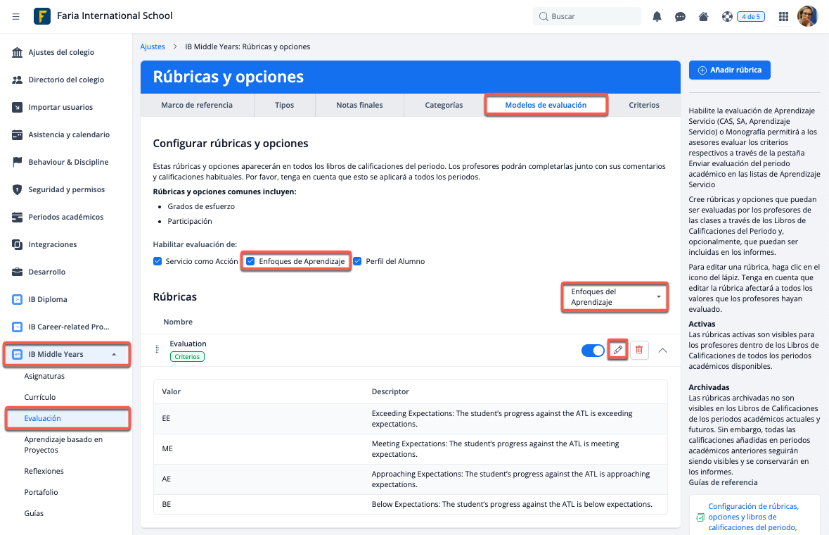 Para activar la evaluación Enfoques del Aprendizaje (EDA), ve a Ajustes > IB Middle Years > Evaluación > Modelos de evaluación